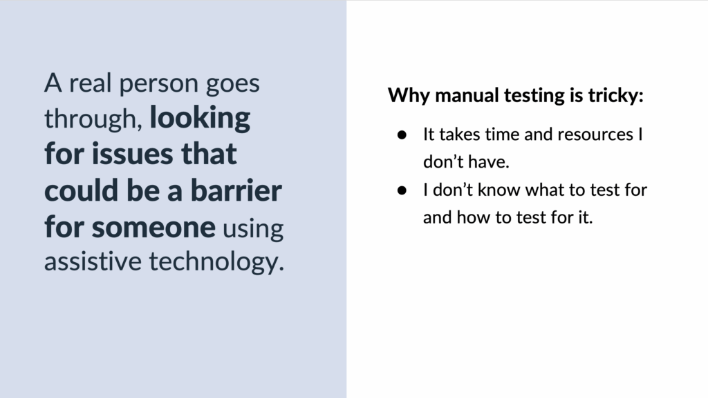 So, manual testing: it is a real person, goes through looking for issues that could be a barrier for someone using assistive technology. So, a real person is looking for issues that could be a barrier for someone using assistive technology. That’s what manual testing is at its core.