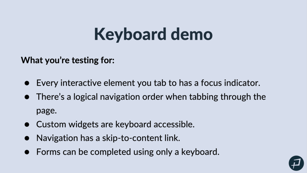 Okay, so what we are testing for in a keyboard demo: Every interactive element you tab to has a focus indicator. So, a focus indicator is what visually shows where the keyboard is on the page. And we’ll see that in our demo and I’ll point that out.