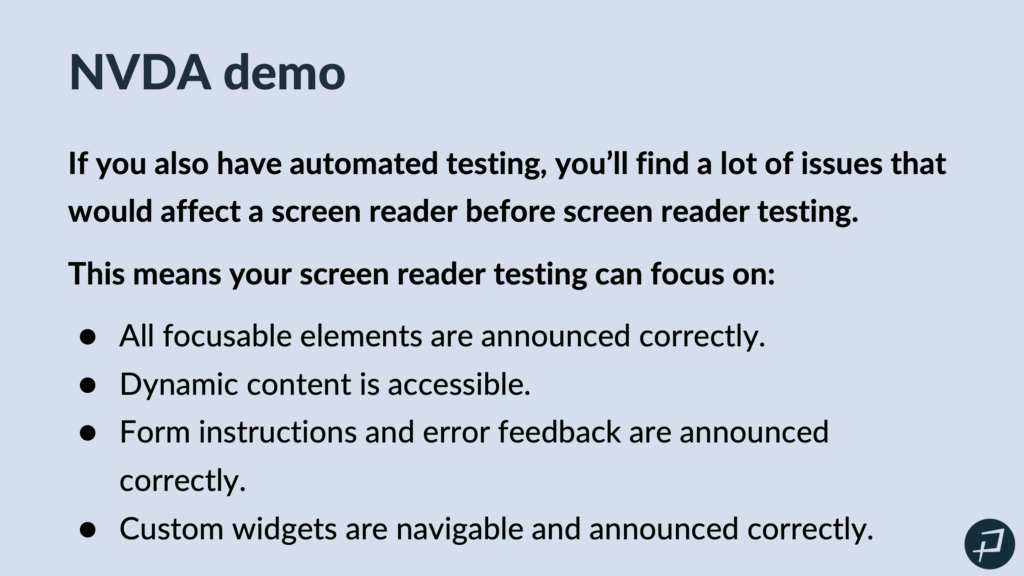 Whitney Lewis: Okay, so we will do an NVDA demo. If you have already done automated testing, so this is going back to automated and manual testing work better together, you’ll find a lot of issues that would affect a screen reader before screen reader testing. And that’s great because that helps you understand what is actually an issue. So, this means your screen reader testing can focus on all focusable elements are announced correctly. Dynamic content is accessible.