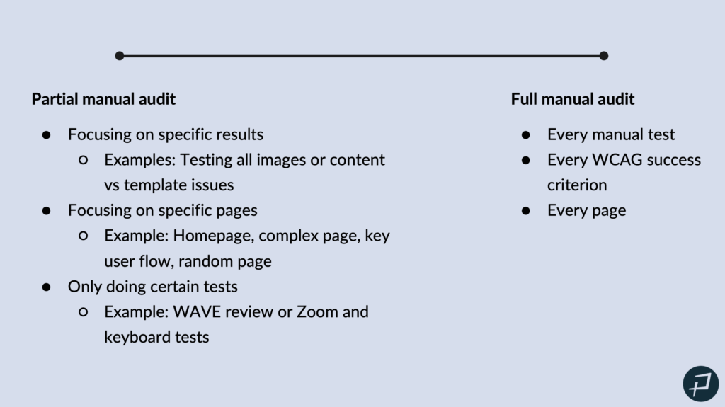 Okay. And then on the other side of the continuum, we have that full manual audit. And so, that full manual audit is every manual test, every WCAG success criterion, on every page. And that’s typically for a lot of organizations is going to be like a third-party manual audit that you outsource to an accessibility company that does that.