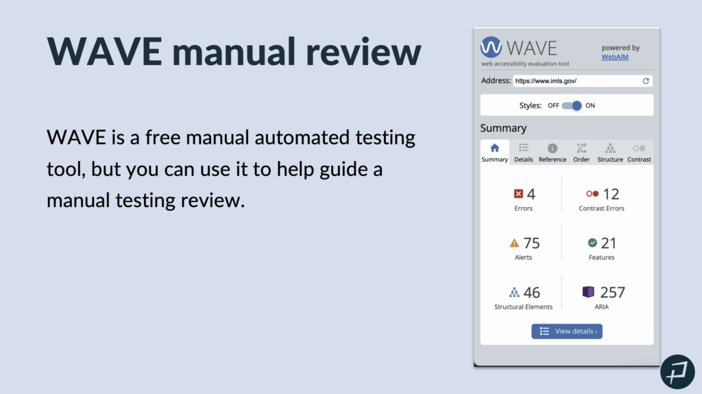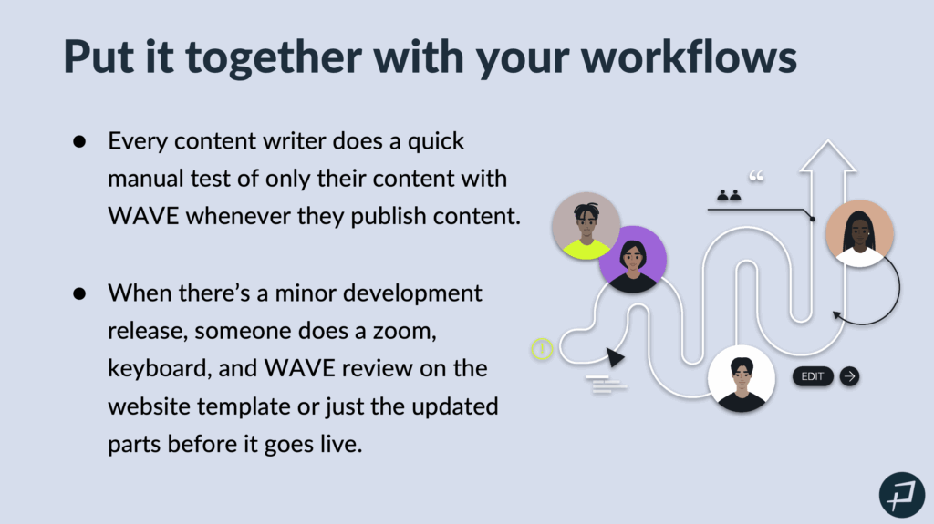 Or, if that’s not for your organization, then once a year you do a manual test on four pages of your website. So, you do all the manual tests that we talked about today. You do keyboard, you do screen reader, you do a WAVE manual review and zoom tests, but you only pick four pages. And that gives you a good sense of your website’s testing and helps you find issues that manual testing is really good at finding.