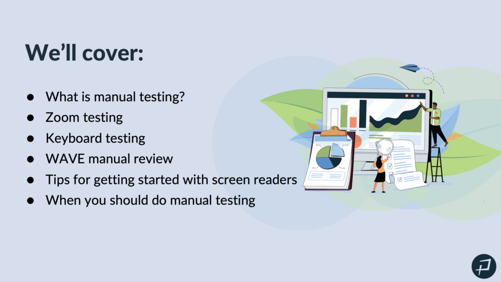 We’re going to cover three, well, four different types of manual tests. So, zoom testing, keyboard testing, a wave manual review. So that’s with the free wave extension. Tips for getting started with screen readers and when you should do manual testing. And that part’s really going to cover how you can incorporate manual testing into your workflows.