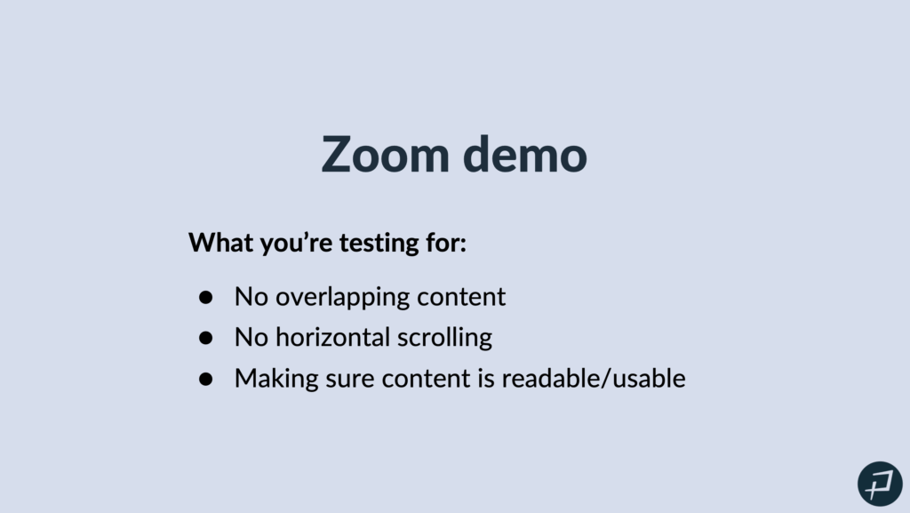 Whitney Lewis: So, with zoom tests, there’s two tests that we’ll do when we’re doing a zoom manual test and that is zooming in to 200 %. That’s the first test. And the second test is to adjust the viewport to 1280 pixels wide and then zoom to 400%.
