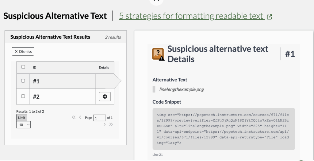 For example, a Suspicious alternative text detail view shows the Alternative text, code snippet, and documentation.